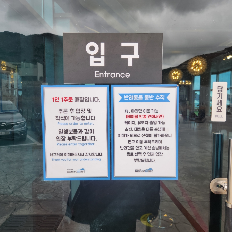 입구에 1인 1주문 안내와 반려동물 동반 관련 안내가 붙어 있어요